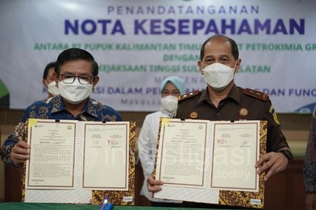 Gresik, Investigasi.today Petrokimia Gresik menggandeng Kejaksaan Tinggi (Kejati) Sulawesi Selatan (Sulsel) untuk meningkatkan kelancaran sekaligus pengamanan penyaluran pupuk bersubsidi. Komitmen ini tertuang dalam Nota Kesepahaman yang ditandatangani langsung oleh Direktur Utama Petrokimia Gresik, Dwi Satriyo Annurogo bersama Kepala Kejaksaan Tinggi (Kajati) Sulawesi Selatan, Raden Febrytrianto di Makassar, Rabu (9/3).
