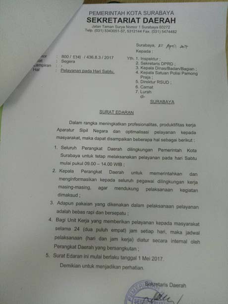 Surat edaran yang berlaku mulai 1 mei 2017 menerangkan bahwa seluruh PNS Pemkot