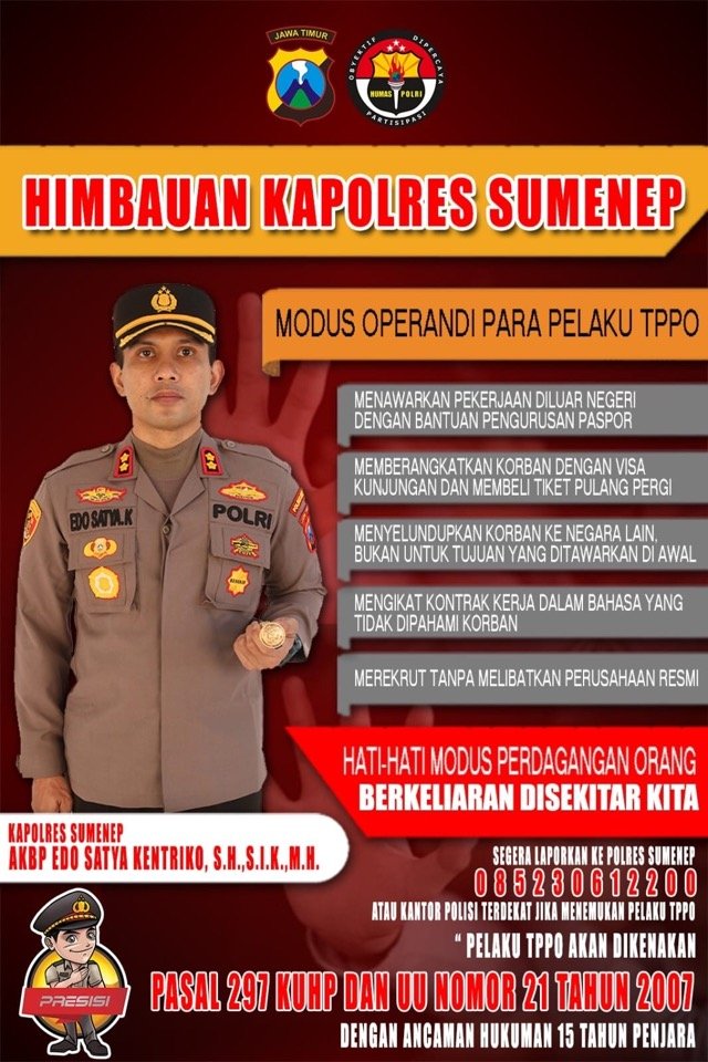 Sumenep, Investigasi.today – Kapolres Sumenep Madura Jawa Timur AKBP Edo Satya Kentriko,S.H.,S.I.K.,M.H menghimbau  kepada masyarakat untuk meningkatkan kewaspadaan terhadap modus perdagangan orang yang saat ini berkeliaran di sekitar kita. Hal ini dilakukan sebagai upaya pencegahan terhadap Tindak Pidana Perdagangan Orang (TPPO) yang semakin merajalela.