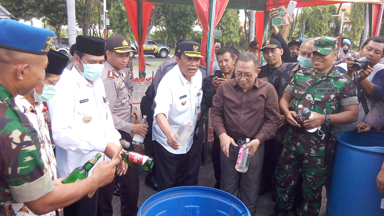 Gresik memusnahkan ribuan botol miras berbagai jenis dengan cara memecah botol