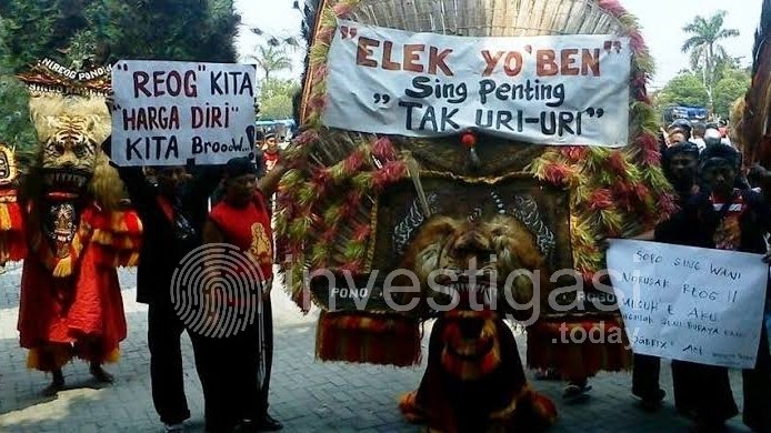 Ponorogo, Investigasi.today – Ratusan seniman Reog Ponorogo tumplek blek di Jalan Alun-alun Utara depan Patung Singa sejak Kamis (7/4/2022) malam hingga Jumat (8/4/2022). Mereka berkumpul untuk melakukan aksi protes atas pernyataan bahwa Malaysia mau mencatatkan Reog sebagai kebudayaan negaranya ke United Nations Educational, Scientific and Cultural Organization (Unesco).
