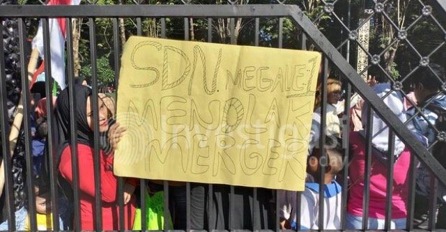 Sebagian tulisan di poster menyuarakan bahwa kebijakan merger SD Megale 1 tidak sesuai di lapangan hingga membuat anak didik terlantar.